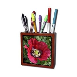Product Description : Redish Poppy with two bees Tile Pen Holder is measuring 5w x 5h x 2d. Made from high quality solid mahogany wood with satin finish and one 4.25 commercial grade mirror gloss ceramic tile. Looks great on a desk or counter top with a full color custom imaged tile.